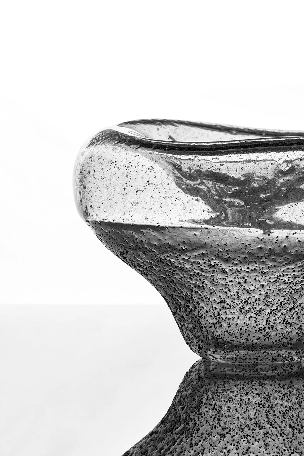 This collaboration as glass, a subject matter and an apparatus to Nicola’s camera magnified new textures in the process. The sand grains, infused into the glass are not always visible to the naked eye. Through Nicola’s artistic approach, the imagery reveals detailed textures and colours within the material while bringing forth the sculptural forms.