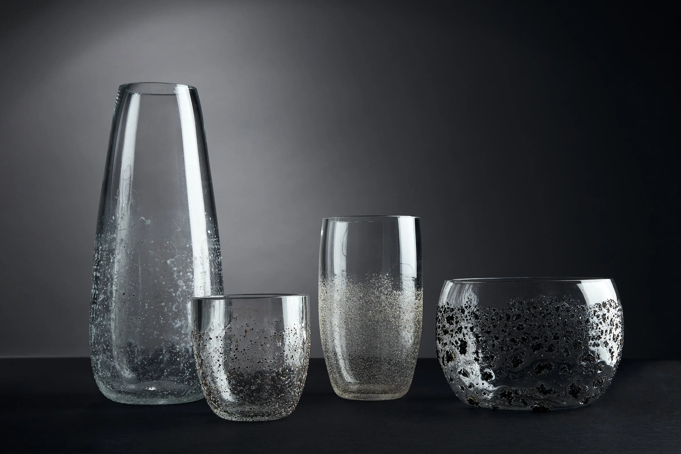 This collection features a bowl, a carafe, a tall cup, and a short cup, designed to showcase the tactile quality of sand. The sands are strategically applied to the outer surfaces, where the glass comes in contact with hands, providing a unique haptic experience. Local glass artists hand-blow each item in the collection.